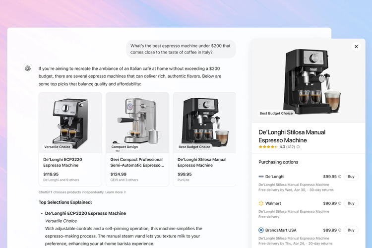 Dalam utas yang sama, OpenAI membagikan video demonstrasi cara fitur Shopping di Search ChatGPT bekerja. Misalnya, pengguna ChatGPT mencari produk dengan kueri "apa mesin espresso terbaik di bawah 200 dollar AS yang mendekati rasa kopi di Italia?".